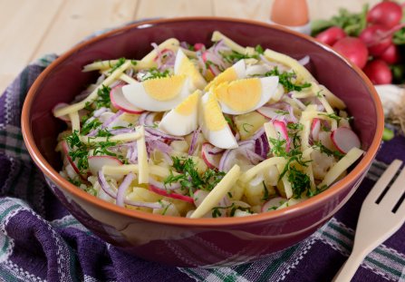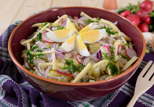Cebulę czerwoną obierz i pokrój w cienkie piórka, rzodkiewki w plasterki, a żółty ser zetrzyj na tarce o dużych oczkach lub pokrój w cienkie słupki. Rozłóż te składniki równomiernie na wierzchu sałatki.