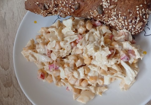 1. Siekamy małą główkę kapusty pekińskiej. Dodajemy puszkę odsączonej kukurydzy, pokrojona w kostkę paprykę i na drobną kosteczkę cebulkę. Ugotowane i pokrojone jajka. Mieszamy wszystkie składniki w misce dodając 4- 5 łyżek majonezu i przyprawy do smaku, ja dodaję jeszcze trochę sosu worcestershire aby podkręcić smak 2. Podajemy jako dodatek do świeżej bułeczki albo do obiadu