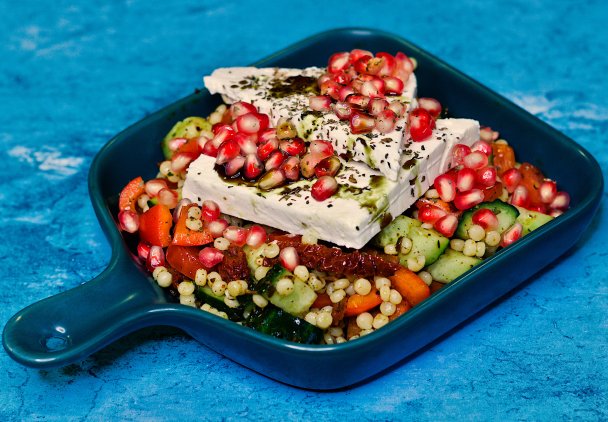 Sałatka z perłowym kuskusem, fetą i granatem - pełna smaku i niezwykle kolorowa. Sprawdzi się świetnie jako lunch do pracy albo lekka kolacja.