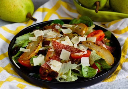 Pyszna i kolorowa sałatka idealna do pracy lub na lekką kolację. Słodka karmelizowana gruszka, salami, ser Džiugas i sos miodowo-musztardowy - czyli bomba smaków!