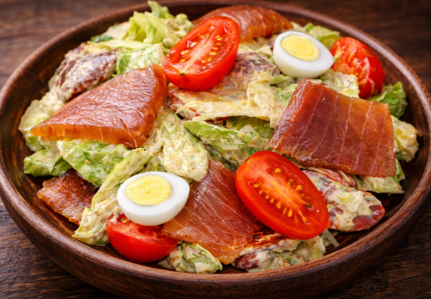 Przed podaniem dekorujemy sałatkę kawałkami tuńczyka, jajkami i pomidorkami cherry.
