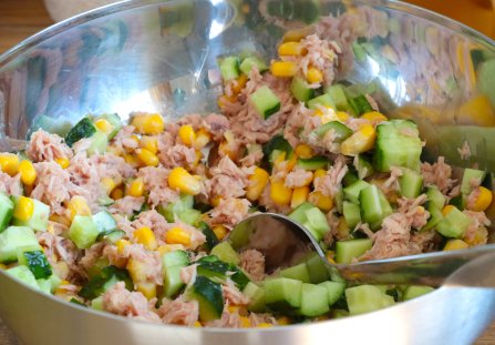 Sałatkę z tuńczykiem i ogórkiem wstaw do lodówki na co najmniej 30 minut, by smaki się połączyły.