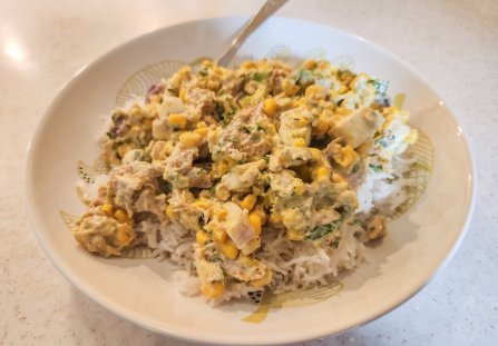 Do miski sałatkowej przenieś ryż. Na wierzchu rozłóż masę z tuńczyka.