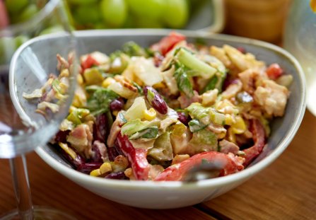 Sałatka z wędzonym kurczakiem jest sycąca, świeża i chrupiąca. A dodatkowo ma pyszny sos szczypiorkowy z dodatkiem musztardy. Podaj ją w dużej misie na rodzinny obiad, w eleganckiej salaterce na stół imprezowy albo zapakuj do lunchboxa.