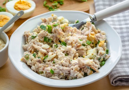 Pokrój w drobną kostkę. Połącz w misce z rybą.