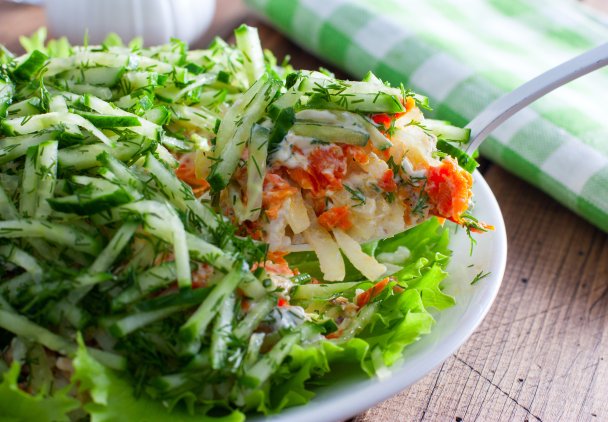 Sałatka z zielonym ogórkiem to przepis na świeży, chrupiący dodatek do obiadu czy też propozycja na samodzielny, lekki lunch. Całość jest połączeniem kontrastujących ze sobą kolorów, tekstur i smaków. Duża ilość koperku dodaje przyjemnego, ziołowego aromatu, który odświeża całe to danie. Z kolei żółty ser i sos z czosnkową nutą sprawiają, że danie jest dość pożywne i wyraziste w smaku. Sałatkę podawaj na talerzu z liści sałaty, dzięki czemu zachwycisz wszystkich!