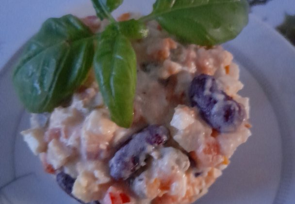 Pachnące i aromatyczne warzywa ugotowane w rosole, z dodatkiem innych warzyw tworzą super smaczną sałatkę.