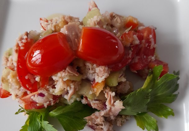 Sałatka z kuskusem, tuńczykiem i warzywami , wprost na drugie śniadanie do pracy.