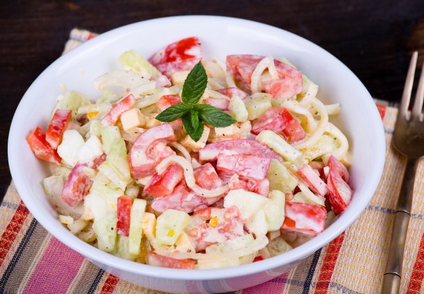 Najsmaczniejsze dania to często te najprostsze. Nie ma nic pyszniejszego niż dojrzałe pomidory z cebulą i śmietaną! Uważasz, że to zbyt mało, by powstała super sałatka do obiadu? Dodaj świeży ogórek, odrobinę majonezu i soku z cytryny. To wciąż prosta sałatka, ale z bogatszym bukietem smaków. Pasuje zarówno do dań mięsnych i rybnych, jak i do wegetariańskich.
