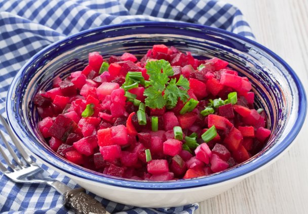 Niezwykle wyrazista surówka z buraka i gruszki z dodatkiem czerwonej cebuli. Stanowi świetny dodatek do pieczonych mięs. Nadaje potrawom lekkości i wyrazu. Przygotujecie ją zaledwie w kwadrans.