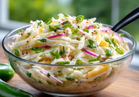 Surówka z jalapeno to świetna propozycja dla miłośników pikantniejszych smaków. Jest wyjątkowym połączeniem świeżości i wyrazistości, które idealnie uzupełni każde danie główne, szczególnie mięsne. Chrupiąca biała kapusta stanowi bazę dla tej kompozycji, a towarzyszą jej soczyste warzywa. Całość spaja kremowy dressing na bazie majonezu i gęstego jogurtu naturalnego z dodatkiem nuty słodyczy. Surówka stanowi idealny balans wszystkich smaków; jest orzeźwiająca, kolorowa i uniwersalna.
