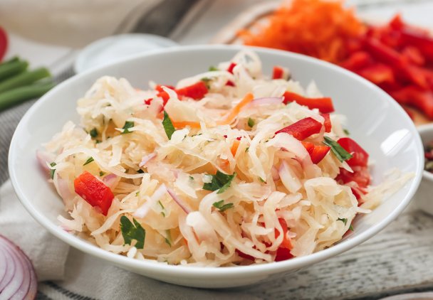 Surówka z kapusty kiszonej to klasyczny dodatek do dań głównych. Doskonale pasuje do mięs i ryb, ale nie tylko.