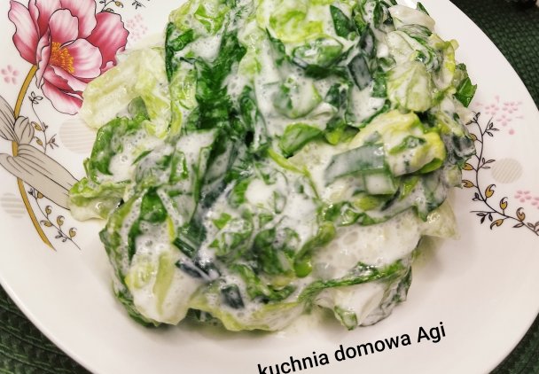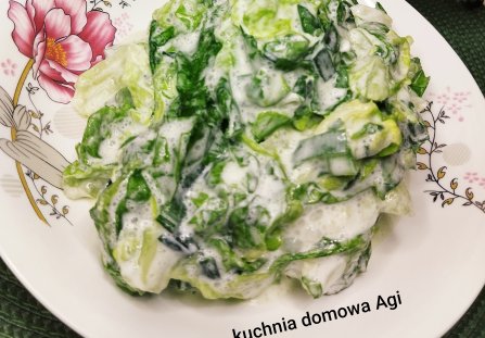 Jak już szczypior jest miękki należy dodać najlepiej rwaną dłońmi sałatę, wsypać cukier dodać ocet lub kwasek kto jak woli ja osobiście wolę z octem. Dokładnie wymieszać po czym dodać śmietanę lub jogurt