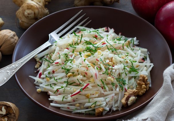 Surówka z topinambura to wyjątkowe połączenie świeżości, słodyczy i chrupkości. Topinambur, nazywany też słonecznikiem bulwiastym, nadaje jej lekko orzechowy smak, który doskonale komponuje się z jabłkiem, marchewką i chrupiącymi orzechami włoskimi. Całość spaja delikatny miodowo-cytrynowy sos.