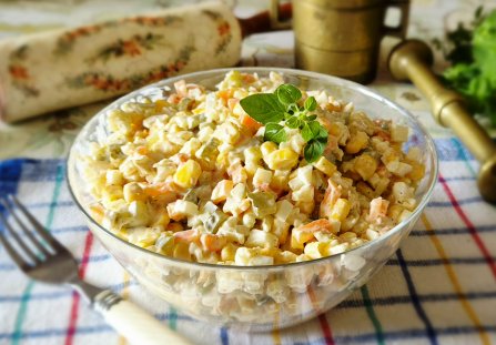 Kukurydzę osaczamy z zalewy i dorzucamy do pokrojonych warzyw. Mieszamy całość z majonezem i przyprawiamy do smaku pieprzem oraz solą.