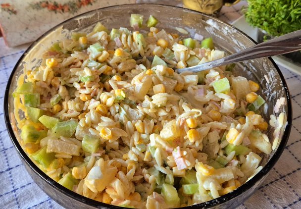 Prosta sałatka z makaronu orzo, ananasa, selera naciowego, jajek, szynki, ogórka i kukurydzy. Do niej sos majonezowy z odrobiną czosnku. Sałatkę można podać ma większej imprezie, sprawdzi się również na grillu. Jest bardzo smaczna, delikatna i szykowna.