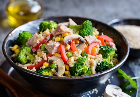 Zdrowa sałatka na kolację pełna warzyw, komosy ryżowej i tuńczyka to pyszna propozycja na zbilansowany posiłek dla całej rodziny.