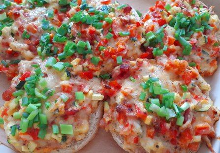 Na połówkach bułeczek rozłożyć równo cały farsz. Wstawić do nagrzanego do 180 stopni piekarnika na ok 20 - 30 min. Po wyjęciu z piekarnika posypać pokrojoną zieloną cebulką.