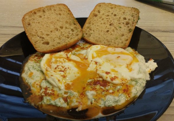 Teraz wszystko układamy na tależ na początku : Na talerz rozsmarujemy jogurt polewamy roztopionym masłem z przyprawami dodajemy jajka. Warto spożywać z świeżym pieczywem Smacznego