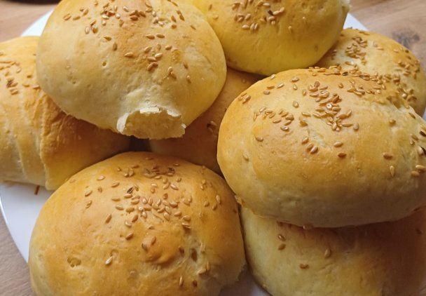 Pieczenie: Piekarnik nagrzej do 180–190°C (góra–dół). Bułeczki posmaruj rozkłóconym jajkiem lub mlekiem. Posyp sezamem, makiem lub zostaw gładkie. Piecz przez 15–20 minut, aż będą złociste.