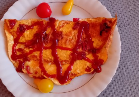 Szybki omlet na śniadanie lub kolację. Polany ketchupem. Składniki podane na omlet dla jednej osoby.