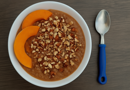 Pyszna i słodka dynia,kakao,goździk i cynamon i do tego pyszne masło orzechowe :).Owsianka w sam raz na jesienne poranki :).