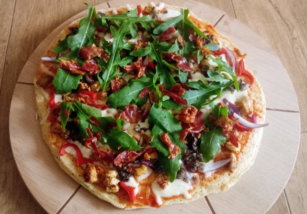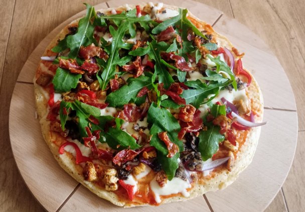 Zapiekamy około 10 minut, wyciągam z piekarnika posypujemy rukolą oraz pokruszonym bekonem.