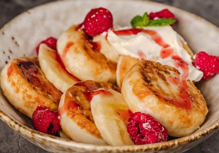 Usmażone racuszki serowe serwuj z ulubionymi dodatkami.