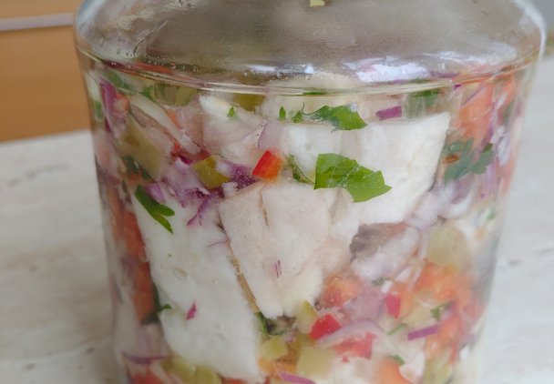 Śledzie obrać ze skóry, pokroić na kawałki. Cebulę, paprykę, ogórki pokroić w drobną kostkę, natkę pietruszki posiekać. wszystkie składniki włożyć do miski i dobrze wymieszać. Następnie wkładamy do słoików lekko przyciskamy i zalewamy olejem. Słoiki wstawiamy do lodówki i zostawiamy na 2 -3 dni aby składniki się przegryzły.