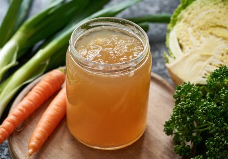 Po 2-3 godzinach dodaj warzywa i przyprawy, z wyłączeniem soli. Gotuj całość przez co najmniej 12 godzin, a nawet do 24 godzin – im dłuższy czas gotowania, tym więcej kolagenu znajdzie się w bulionie.