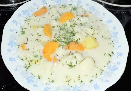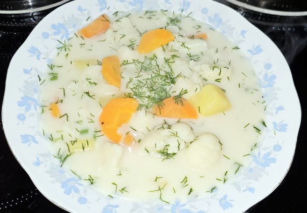 3. Kalafior: Do ziemniaków dodajemy różyczki kalafiora. Gotujemy 15-20 minut, kontrolując, by kalafior się nie rozgotował.