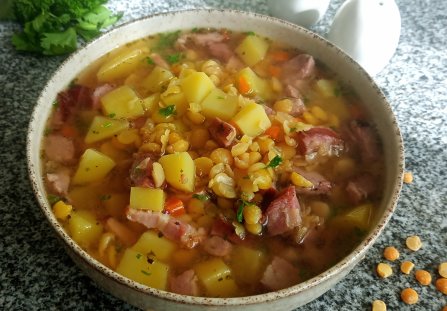 Po upływie tego czasu rosół wlewamy do garnka, dokładamy żeberko, przyprawy w ziarnkach, liść laurowy oraz zielenina zagotowujemy i gotujemy około 40 minut. Następnie dodajemy namoczony, ponownie wypłukany groch, gotujemy około godzinę dokładamy ziemniaki i gotujemy do miękkości.