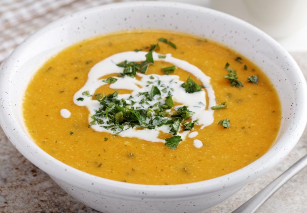 Zmiksuj zupę blenderem na gładki krem. Jeśli jest zbyt gęsta, dolej resztę bulionu. Rozlej ją do miseczek i podlej mleczkiem kokosowym dla ozdoby. Na koniec posiekaj natkę pietruszki i wysyp ją na wierzch.