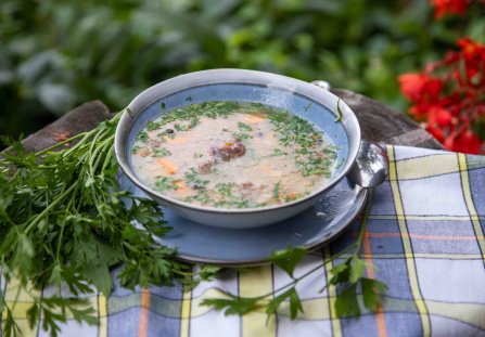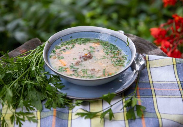 Podawać z kawałkami mięsa, natką pietruszki i lubczykiem.