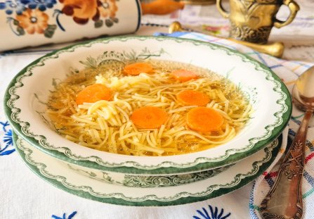 Na talerze dajemy ugotowany makaron, marchewkę pokrojoną w plasterki i rosół.