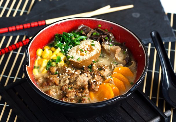 Na talerzach lub w miskach układamy porcje makaronu, pół jajka, mięsa, grzybów, marchewki, jarmużu lub pak choi i kukurydzy. Całość zalewamy zupą i posypujemy szczypiorkiem i sezamem. Podajemy od razu.