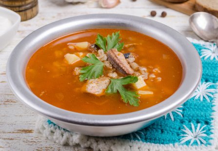 Na końcu dodać czosnek przeciśnięty przez praskę. Zupę podawać z cieńkim makaronem lub pieczywem.