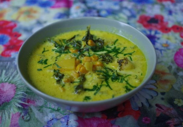 Złoty chowder zawdzięcza swój piękny, słoneczny kolor ziarnom kukurydzy i obecności kurkumy. Bo to właśnie one sprawiają, że ta prosta, pożywna zupa jarzynowa błyszczy złotem i jaskrawą żółcią nawet w najbardziej ponury dzień. Chowder idealnie nadaje się na obiad lub kolację w listopadzie, grudniu i styczniu, gdy dni są krótkie i często pochmurne, a przez to trochę smutne. Wtedy zawsze przyda się odrobina słońca na talerzu.