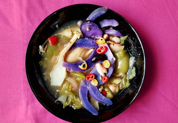 Dziś, jako że sezon był urodzajny to jest bajecznie pyszna zupka ANASAZI KOKOPELLI czyli zupka z przepysznych fasolek Anasazi, owoców Tomatillo, bulw Topinaburu , Meksykańskiego Oregano , kurczaka i papryczek chilli z dodatkiem niebieskich ziemniaków ️ Ps. 1 ) Aranżacja dania przedstawia antycznego ducha Kokopelli postać z mitologii rdzennych ludów Południowego zachodu Aneryki, najczęściej przedstawiana jako garbaty flecista, bóstwo «!nav>>płodności, który symbolizuje życie, radość, urodzaj i odnowę. Jest on również związany z wiatrem, deszczem ogrodnictwem, muzyką i tańcem . Jego wizerunki, często jako sztuka naskalna, można znaleźć na tym obszarze. Jakie jest znaczenie Kokopelli? Rolnictwo i urodzaj: Jest związany z obrzędami świętymi, ogrodnictwa i rolnictwa. Symbol życia i odnowy: Właściwie jest uniwersalnym symbolem życia i płodności, który przynosi odnowę i harmonię. Duch muzyki i narracji: Jest również pieśniarzem, gawędziarzem, a jego muzyka jest potężnym narzędziem tworzenia harmonii z naturą. Ps. 2 ) Fasola Anasazi jest uważana za niezwykle smaczną fasolę , jest słodsza i bardziej mączysta niż inne fasole. Zawiera również o 75% mniej węglowodanów powodujących wzdęcia w porównaniu np. z fasolą typu pinto