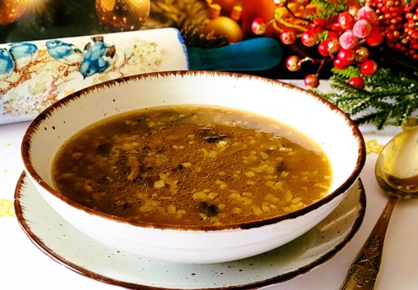 Nasza babcia Ksenia gotowała na wigilię zupę grzybową z kaszą gryczaną. Jedliśmy ją całe święta. Tradycję podawania tej zupy w wigilię przeniosłam do mojego domu, mąż ją uwielbia. Teraz mamy na stole dwie zupy- barszcz czerwony z uszkami i grzybową babci Kseni, zwaną barszczem szarym. Grzyby z kaszą to połączenie bardzo smaczne, zupa rozgrzewa i zaostrza apetyt.