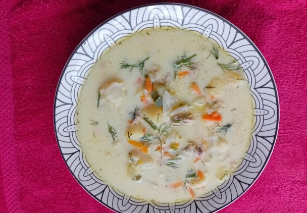 1.W dużym garnku gotuj udka lub korpus w dwóch litrach wody przez 20 minut.Dodaj liście laurowe. 2.Dodaj pokrojone w kostkę warzywa:marchew, seler, pietruszkę i podzielony na kawałki kalafior.Gotuj 15 minut.Dolej wody aby zupa nie była za gęsta. 3.Dodaj pokrojone w drobną kostkę ziemniaki ,gotuj 10 minut. 4.Wyjmij mięso, podziel na kawałki i dodaj do zupy. 5.Dodaj śmietany kremówki i posól zupę. Zagotuj . 6.Dodaj koperek i wyłącz zupę.