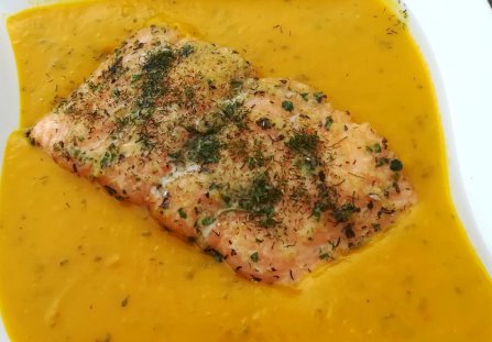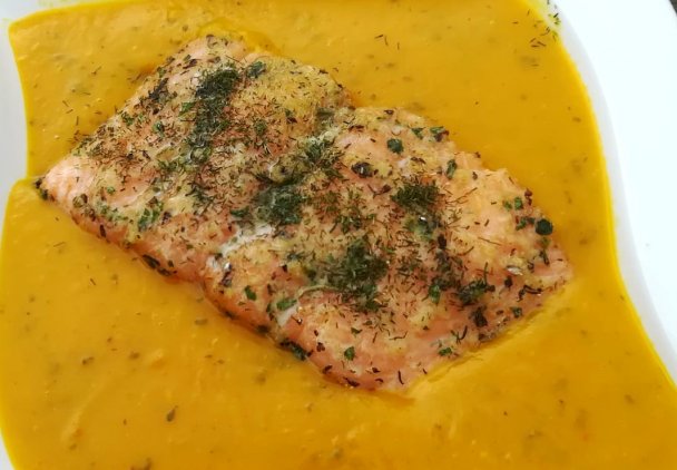 Łososia włóż do rozgrzanego do 80°C piekarnika i piecz przez 60-80 minut. Gdy zobaczysz, jak na kawałkach ryby ścina się białko, a mięso jest delikatnie szkliste, wtedy jest ten moment, żeby wyciągnąć rybę z piekarnika. Pamiętaj, aby dobrze zaplanować czas przygotowania zupy z dyni i łososia. Dodaj łososia do ciepłej zupy.