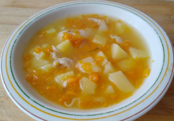 Opłukać mięso drobiowe i włożyć do rondla do zimnej wody ok 1 i ½ litra wody. Gdy zacznie się gotować zebrać szumy i gotować na małym ogniu dalej. Gdy wywar jest już klarowny osolić i dodać włoszczyznę i pokrojoną w plastry marchewkę. Gotować pod przykryciem do miękkości mięsa i marchwi. Wyjąć mięso i oddzielić od kości, olać zupę do innego rondelka, a pozostałe warzywa poszturać szturakiem. Ponownie zalać zupą, włożyć mięso i pokrojone drobno ziemniaki. Gotować do miękkości ziemniaków.