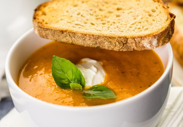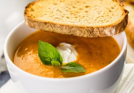 Zupę pomidorową z mascarpone podawaj z chrupiącymi grzankami, groszkiem ptysiowym lub makaronem czy ryżem.