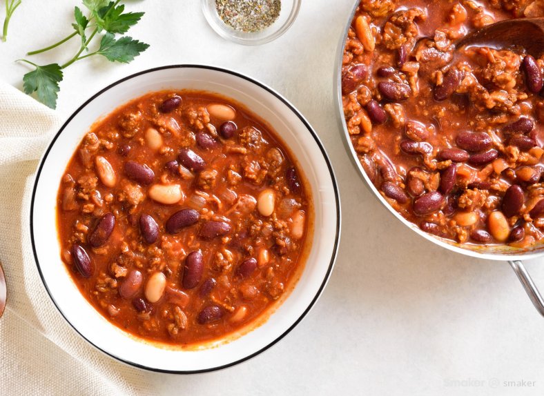 Na dużej patelni lub w garnku podsmaż mięso mielone, czosnek posiekany w drobną kostkę i pokrojoną w kostkę cebulę. Smaż do bardzo mocnego zrumienienia wołowiny. Odlej wytworzony płyn. Wlej na patelnię pomidory w puszce i bulion. Dodaj przyprawy: chili, kminek, oregano i Cayenne.