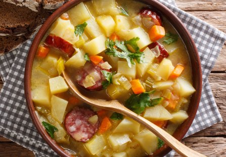 Niezwykle sycąca zupa ziemniaczana z kiełbasą, która z powodzeniem zastąpi dwudaniowy obiad. Świetnie rozgrzewa w chłodne dni. Przygotujecie ją z prostych, łatwo dostępnych składników. Tak przygotowana zupa ziemniaczana nie potrzebuje wielu dodatków – najlepiej smakuje podana z kleksem gęstej śmietany i posiekaną natką pietruszki. Możesz ją również serwować z chrupiącymi grzankami lub pajdą świeżego chleba.