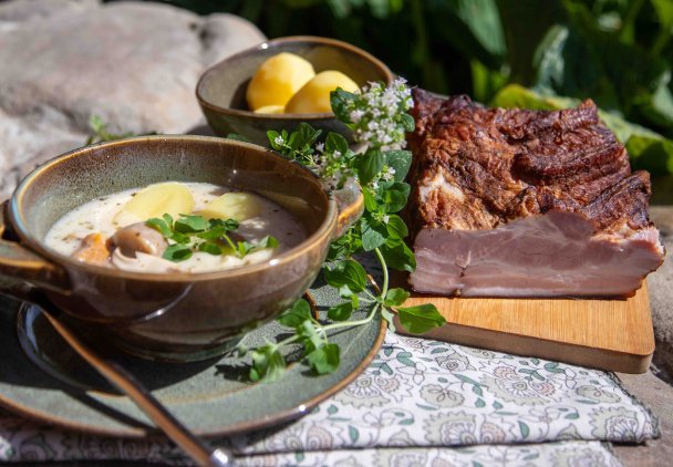 Aromatyczna i sycąca zupa, czyli żurek na wędzonce z dodatkiem leśnych grzybów. Przepis pochodzi z 550. odcinka programu Ewa Gotuje.