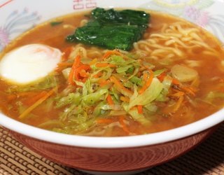 Miso ramen charakteryzuje się bogatym w smaku i pięknie pomarańczowym bulione...