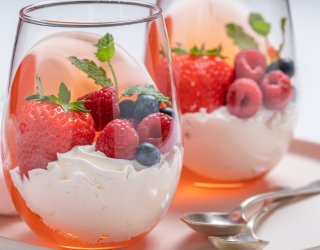 Banalny w przygotowaniu deser z owocami i galaretką. Podany w szklance lub ki...
