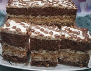 Pyszne ciasto przełożone bezą z masą śmietankową oraz batonami